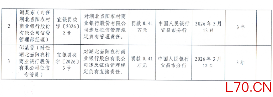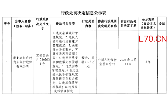 湖北当阳农村商业银行被罚71.8万元:违反金融统计管规定等