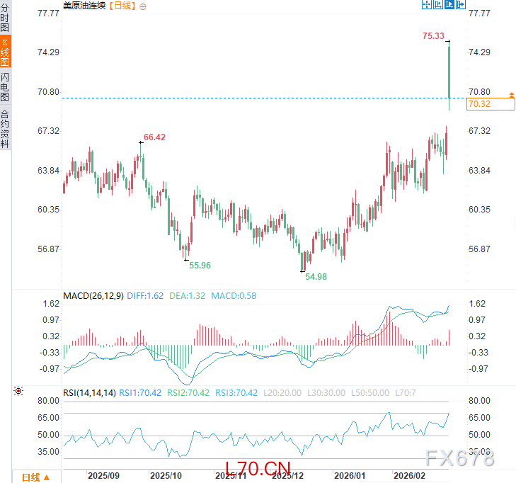 当前冲突已造成美军首例伤亡,并引发地区连锁反应。周一(3月2日)亚市时段,美原油价格跳涨超5%,此前一度触及近九个月高点75.33美元/桶,随后回落,现交投于每桶70.40美元附近,日内涨幅约5%。市场密切关注油价波动、地缘风险溢价以及全球能源供应链潜在中断影响。