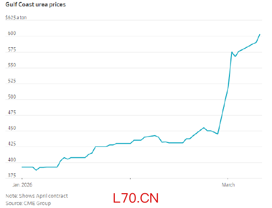 在美国墨西哥湾沿岸,全球使用最广的化肥尿素价格自美以袭击伊朗以来已上涨35%。尿素以天然气为原料生产,全球约 30% 的尿素出口来自中东,且大多要经过现已禁行的霍尔木兹海峡。