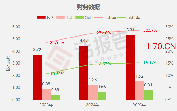 毛利分别约为人民币0.88亿、1.23亿、1.52亿,2025年同比+24.10%;