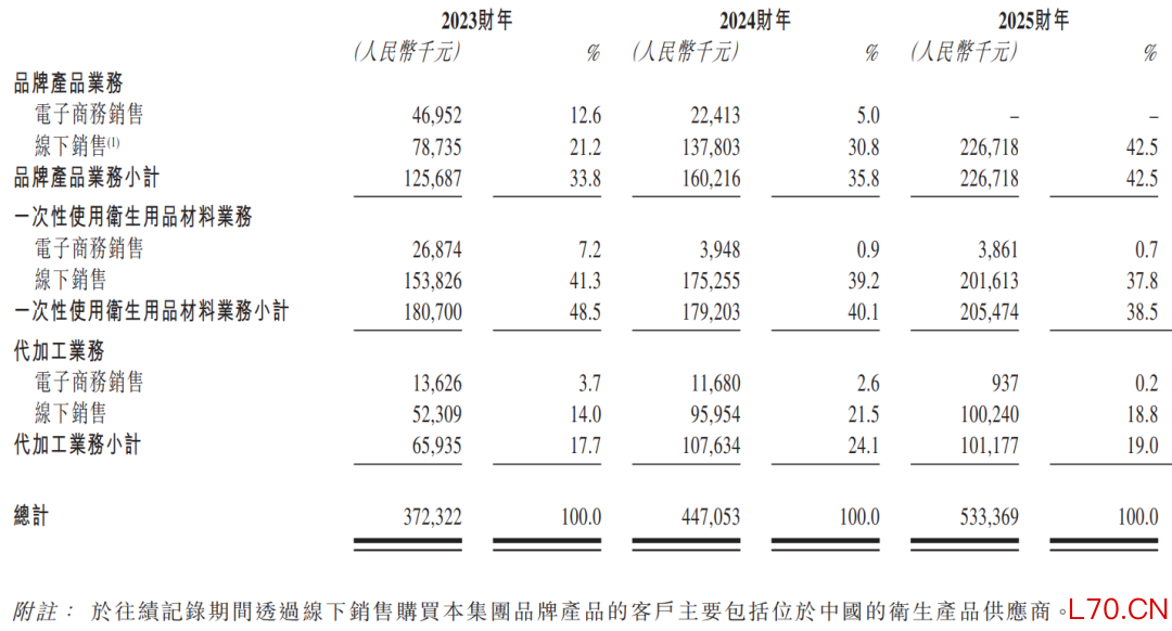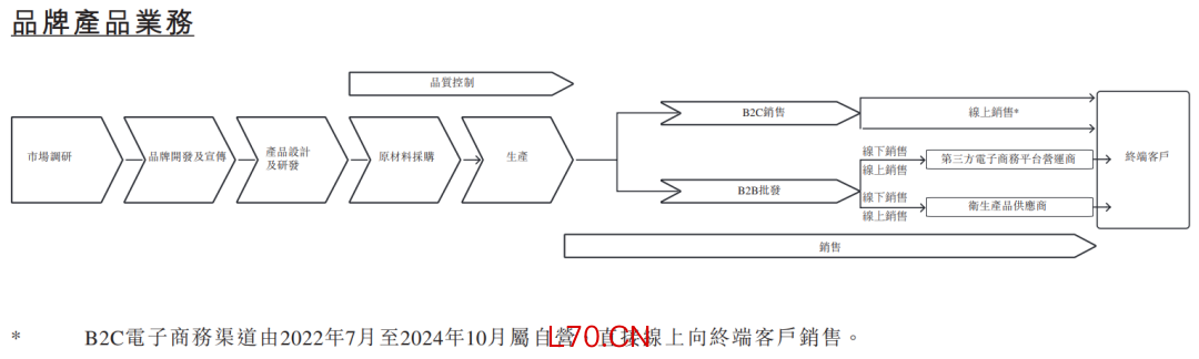 在公司的品牌产品业务下,公司主要在中国境内以多个自有品牌进行一次性使用卫生用品的研发、制造及销售。在往绩记录期间,公司的产品主要通过中国境内的B2C电子商务平台(包括抖音、快手及拼多多)以及超市和婴儿护理店等线下零售渠道销售给企业客户,而国际B2B平台仅贡献了微薄的收益。