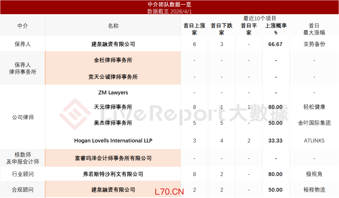 据LiveReport大数据统计,焦点国际中介团队共计10家,其中保荐人1家,近10家保荐项目数据表现普通;公司律师共计4家,综合项目数据表现有待提升。整体而言中介团队历史数据表现中规中矩。