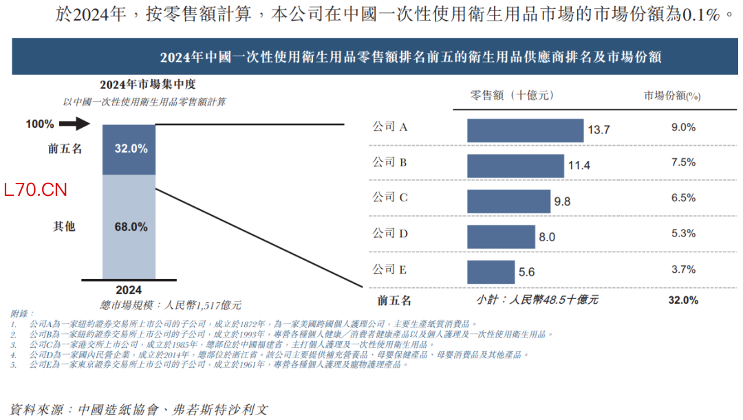 中国一次性使用卫生用品市场相对集中,于2024年,按零售额计算,前五大一次性使用卫生用品供应商合计占市场份额32.0%。于2024年,按零售额计算,公司在中国一次性使用卫生用品市场的市场份额为0.1%。