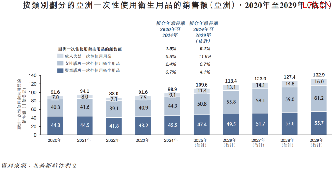 根据弗若斯特沙利文(Frost & Sullivan)的报告,在销售额方面,亚洲一次性使用卫生用品市场规模由2020年约916亿美元增长至2024年约989亿美元,复合年增长率约为1.9%。预计该市场将继续扩张,到2029年将达到1329亿美元,自2024年起复合年增长率约为6.1%。
