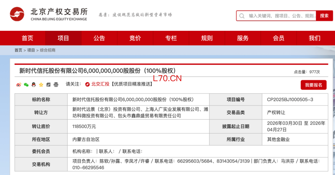 新时代信托100%股权再次打折转让。根据北京产权交易所官网,新时代信托60亿股股份正在挂牌中,合计涉及公司100%股权,挂牌底价为11.85亿元。本次转让披露起止日期为3月30日至4月27日。