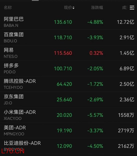 中概互联板块承压。阿里巴巴下跌4.88%,比亚迪股份下跌4.5%,百度、美团跌超3%,拼多多、京东跌超2%。