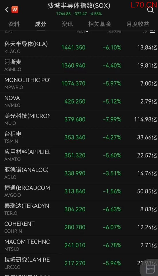元股证券:ygzq.hk费城半导体指数下跌4.58%,成份股中,美光科技下跌7.99%,泰瑞达、科天半导体、COHERENT等跌幅超6%。
