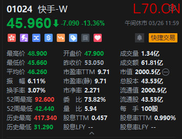 快手跌超13%。大摩发表研究报告,对快手2026年至2028年每股盈测下调17%至24%,其目标价由73港元下调25%至55港元,其评级为‘与大市同步’。大摩称,加码投资AI在中国科网股中属常见,但总收入显著减速(特别是在线营销)引起对投资回报的忧虑。