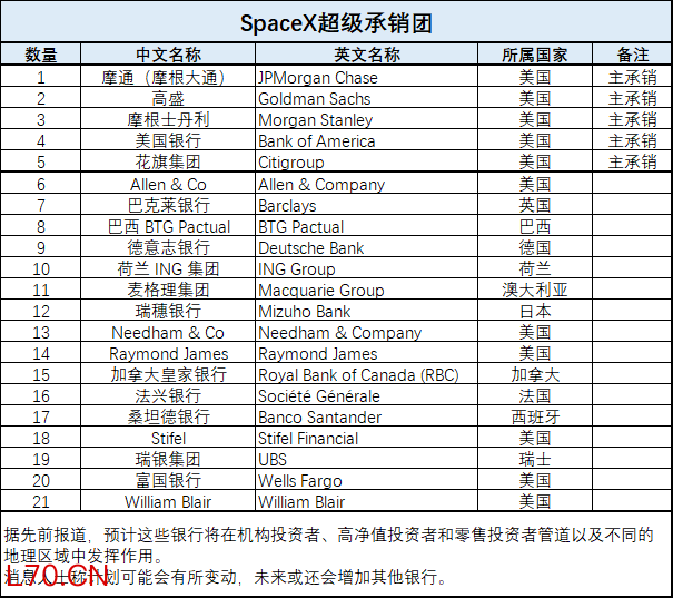 截至2026年3月,SpaceX合并xAI后的最新估值已达1.25万亿美元。为确保股票销售顺利推进,SpaceX组建了一支超级承销团,据报道,高盛、摩根士丹利、美国银行、摩根大通和花旗等全球顶级投行都将参与其IPO工作。