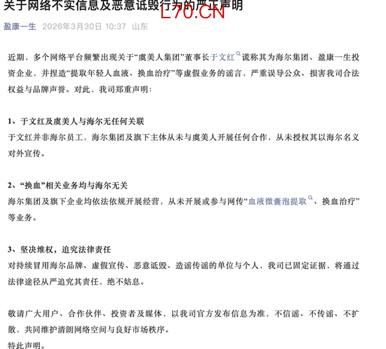 3月30日,海尔集团(青岛)金盈控股有限公司(下称“海尔金控”)通过“盈康一生”官方微信公众号就近期多个网络平台出现的虚假言论进行澄清,于文红涉嫌谎称其企业为海尔集团、盈康一生投资企业,并捏造“提取年轻人血液、换血治疗”等虚假业务。31日,海尔集团方面也表示,不信谣不传谣,所有相关信息参考官方发布。