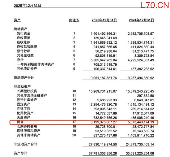 年报显示,上海莱士在控股合并郑州莱士、同路生物、广西莱士、浙江海康及南岳生物后,在合并资产负债表中形成大额商誉。截至2025年12月31日,公司账面商誉余额约为81.99亿元,较2024年末的50.73亿元,同比激增61.6%,一年时间商誉规模增长超31亿元。
