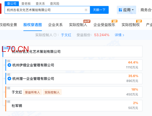 而虞美人集团的内地业务,主要通过其旗下的杭州古名文化艺术策划有限公司(简称“杭州古名公司”)等主体开展。股权穿透显示,于文红为杭州古名公司的实际控制人,受益股份为53.244%。